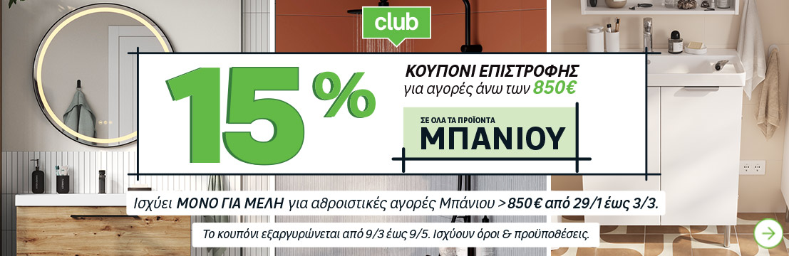 Με την αγορά ειδών Μπάνιου συνολικής αξίας 850€ και άνω, στο διάστημα 29/1 έως 3/3, κερδίζεις κουπόνι επιστροφής 15%, ακόμα και αν μέρος των ειδών αγοράς βρίσκεται σε προσφορά.