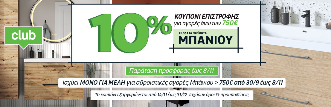 Tα μέλη του club λαμβάνουν την 14/11/2025 κουπόνι επιστροφής με το 10% της τελικής πληρωτέας αξίας των ειδών μπάνιου του συνόλου των αγορών τους στο κατάστημα ή/ και στο www.leroymerlin.com.cy (μετά από τυχόν εκπτώσεις, κουπόνια ή προσφορές).