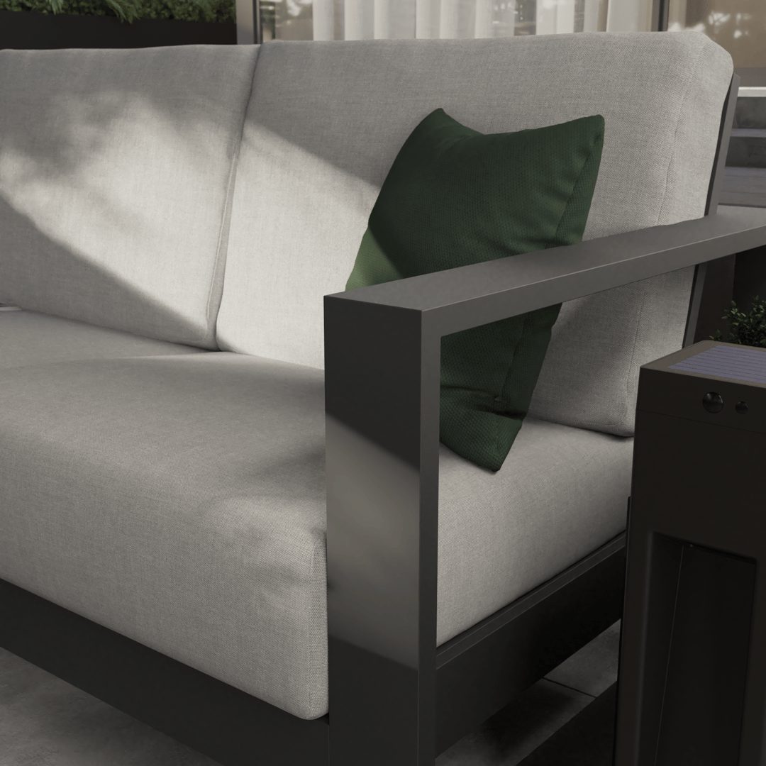Απολαύστε ένα απεριτίφ με φίλους καθισμένοι άνετα στον καναπέ Athena. Ένας μοντέρνος και άνετος καναπές για τα ζεστά καλοκαιρινά σας βράδια. Σχεδιασμένος για 2 άτομα, ο καναπές Athena συνδυάζει άνεση και κομψότητα για να αναβαθμίσει τη βεράντα σας. Τα μεγάλα και χοντρά μαξιλάρια του θα σας προσφέρουν ιδανικά καθίσματα για τα καλοκαιρινά σας βράδια και θα δώσουν ένα χαλαρωτικό ύφος στους εξωτερικούς σας χώρους. Με σκελετό αλουμινίου και αφαιρούμενα υδροαπωθητικά μαξιλάρια, ο καναπές είναι συνώνυμος με την αντοχή και τη στιβαρότητα για να σας συνοδεύει στο χρόνο. Κατάλληλος για επαγγελματική χρήση, μπορεί επίσης να χρησιμοποιηθεί σε βεράντες ξενοδοχείων ή μπαρ. Με κατασκευή από χοντρό αλουμίνιο, οι γραμμές της σειράς Athena είναι ευθείες και εκλεπτυσμένες. Αυτή η διθέσια έκδοση με ανθρακί σκελετό και γκρι μαξιλάρια θα δώσει μια μοντέρνα και κομψή εμφάνιση στους εξωτερικούς σας χώρους. Ολοκληρώνεται με τα τραπεζάκια σαλονιού και άλλες πολυθρόνες της σειράς για να αυξήσετε τον αριθμό των καθισμάτων και να προσαρμόσετε τη διαμόρφωση ανάλογα με τους καλεσμένους σας. Εύκολη φροντίδα.
