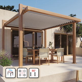 Ζήστε σε απόλυτη αρμονία με το περιβάλλον σας κάτω από την βιοκλιματική πέργκολα Clima Odyssea. Χάρη στις ρυθμιζόμενες περσίδες (από 0 έως 90°), θα έχετε τέλειο έλεγχο του φωτός και του φυσικού αερισμού. Το καλοκαίρι, ρυθμίστε τις περσίδες με τη μανιβέλα για να δημιουργήσετε σκιά: το ανοιχτό χρώμα τους έχει επιλεγεί για να αντανακλά το ηλιακό φως και να αποτρέπει τη συσσώρευση θερμότητας. Η κλίση τους δημιουργεί ένα απαλό, αναζωογονητικό αεράκι που επιτρέπει στο ζεστό αέρα να διαφύγει. Το χειμώνα, ανοίξτε τις περσίδες για να αφήσετε το φως να εισέλθει και να ζεστάνει το χώρο σας. Όταν είναι κλειστές, οι περσίδες κατευθύνουν το νερό της βροχής σε ένα σύστημα αποστράγγισης ενσωματωμένο στα πόδια της κατασκευής. Ανθεκτική και εύκολη στο χειρισμό. Σχεδιασμένη από αλουμίνιο (σκελετός και περσίδες) αυτή η πέργκολα εγγυάται ποιότητα και ανθεκτικότητα. Δεν σκουριάζει και είναι ανθεκτική στις καιρικές συνθήκες και τις ακτίνες UV, εξασφαλίζοντας την ανθεκτικότητά της σε όλες τις εποχές. Τα διπλά τοιχώματα των περσίδων της προσφέρουν αντοχή στις χειμερινές συνθήκες. Εύκολη εγκατάσταση & συντήρηση