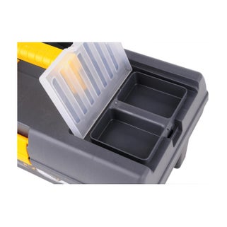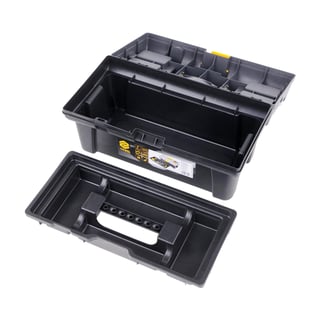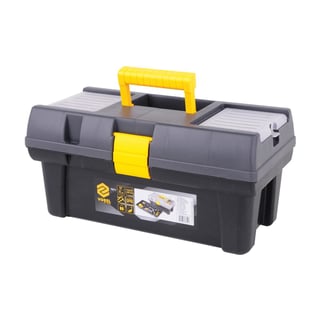 Πλαστική εργαλειοθήκη 16" με λαβή μεταφοράς και θήκες οργάνωσης για αποθήκευση μικρών αντικειμένων στο επάνω μέρος.Η εργαλειοθήκη έχει ειδικά διαμορφωμένες πλαϊνές λαβές για εύκολη μεταφορά. Μπορεί να κλείσει με λουκέτο. Χρησιμοποιείται για εύκολη μεταφορά διαφόρων αντικειμένων, π.χ. εργαλεία, αξεσουάρ ψαρέματος κ.λπ.