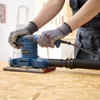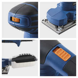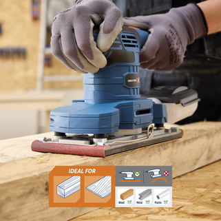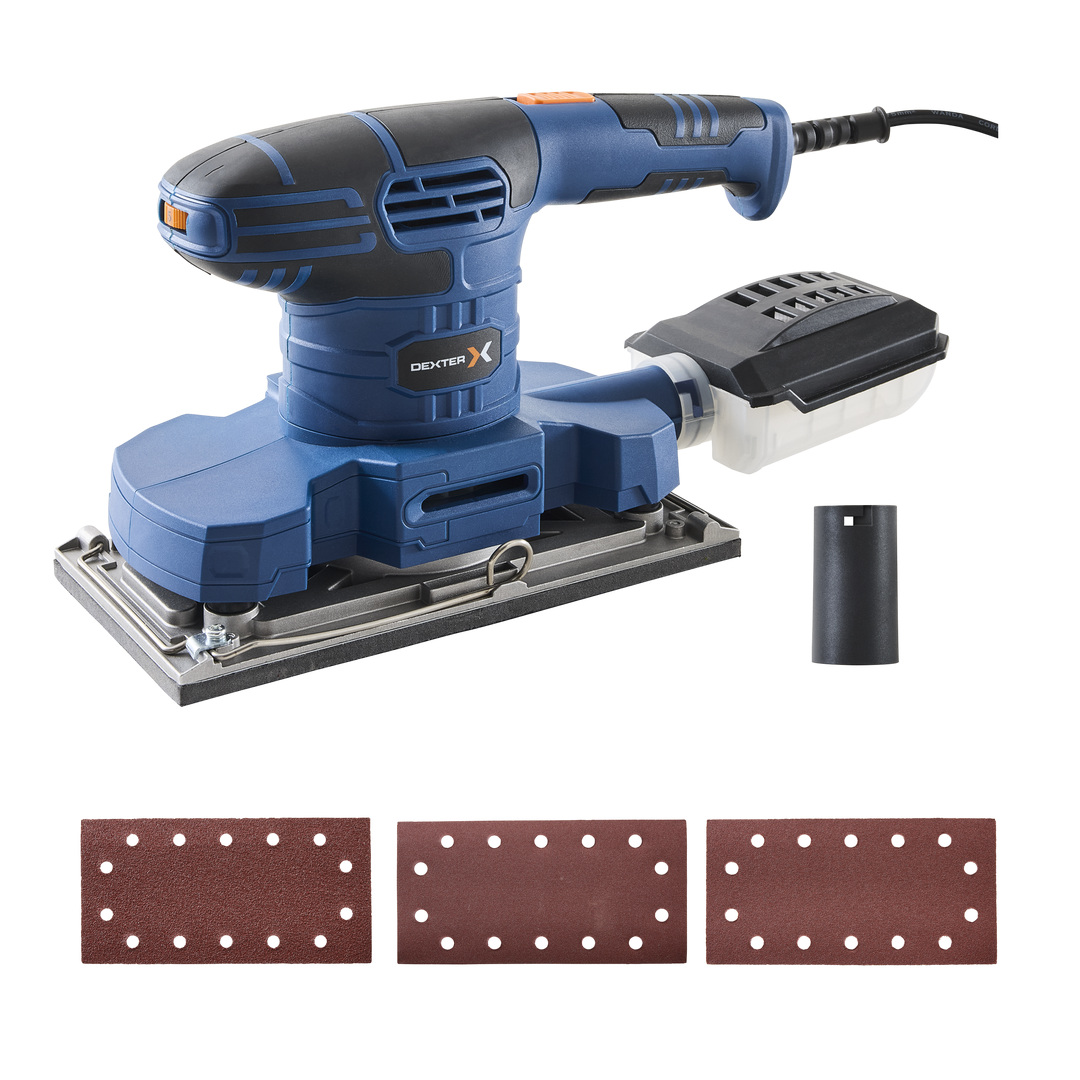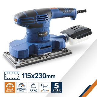 Τριβείο παλμικό DEXTER ρεύματος με παραλληλόγραμμο σχήμα πλάκας σε διαστάσεις M230xΠ115 mm. Λειτουργεί με ταχύτητα περιστροφής στα 12000rpm και είναι ιδανικό για εργασίες λείανσης σε ξύλο πάνω επίπεδες πόρτες και γενικότερα πάνω σε μεσαίες επιφάνειες.