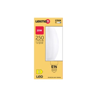 Λάμπα led Lexman σε σχήμα κεριού, διαμέτρου 3,5cm, κατανάλωσης 1,8W (ισοδύναμη με 25W), με απόδοση φωτός 250 Lumen, θερμό λευκό φως (2700Κ). Με διάρκεια ζωής έως και 25000 ώρες, μπορείτε να μειώσετε την ταλαιπωρία της συχνής αντικατάστασης των λαμπτήρων και να απολαύσετε μια ιδανική λύση φωτισμού για περισσότερα χρόνια. Λάμπες LED νέας τεχνολογίας, τόσο για οικιακή όσο και για επαγγελματική χρήση, σε μεγάλη ποικιλία για κάθε ανάγκη. Μεγάλη διάρκεια ζωής και εξοικονόμηση ενέργειας.