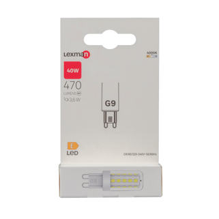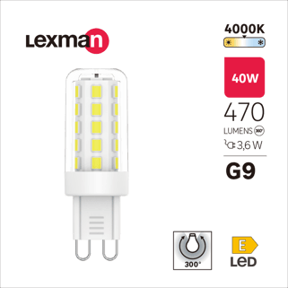 Λάμπα Led Lexman SMD G9 με σχήμα αμπούλας. Αυτός ο λαμπτήρας έχει απόδοση ουδέτερου λευκού χρώματος 4000Κ με ισχύ 470 Lumen, ίση με 40 Watt ενέργειας, αλλά καταναλώνει μόνο 3,6 Watt. Έχει ωφέλιμη διάρκεια ζωής 25.000 ώρες, με μεγάλη διάρκεια ζωής και σημαντική εξοικονόμηση ενέργειας.