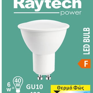 Λάμπα Led Raytech G10 με σπέιρωμα Ε14. Αυτός ο λαμπτήρας έχει απόδοση θερμού λευκού χρώματος 3000Κ με ισχύ 490 Lumen, ίση με 40 Watt ενέργειας, αλλά καταναλώνει μόνο 6 Watt. Έχει ωφέλιμη διάρκεια ζωής 25.000 ώρες, με μεγάλη διάρκεια ζωής και σημαντική εξοικονόμηση ενέργειας.