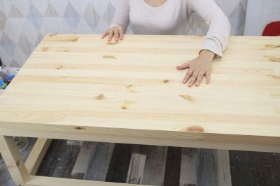 - Tοποθέτησε την τάβλα τραπεζιού πάνω στο σκελετό που έχεις ετοιμάσει. Γύρισε όλη την κατασκευή ανάποδα και βίδωσε την τάβλα με τα καδρόνια