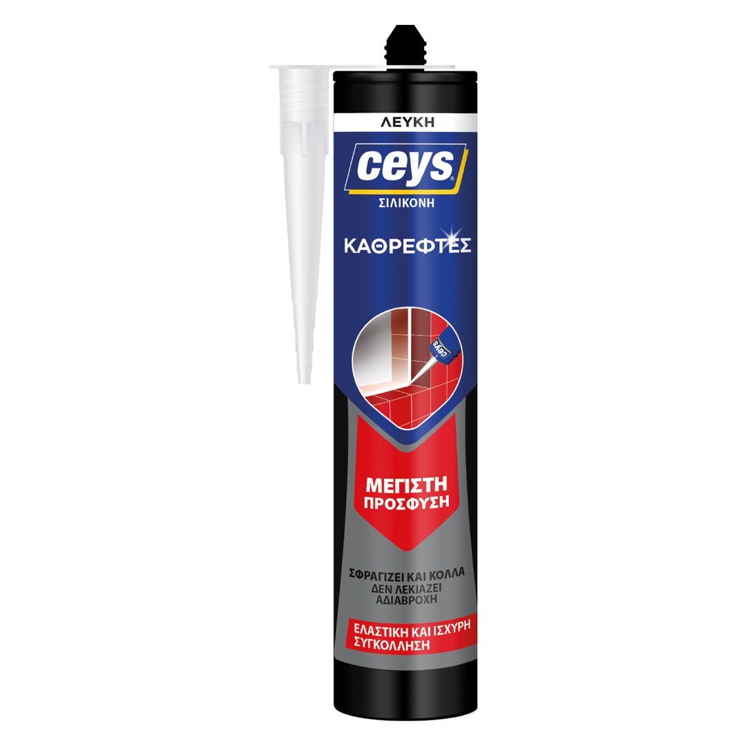 Ειδική σιλικόνη για καθρέφτες και τζάμια. Η σιλικόνη Ceys σε λευκό χρώμα εξασφαλίζει ισχυρή συγκόλληση χωρίς να καταστρέφει το κράμα του καθρέφτη. Ιδανική για αρμολόγηση και στεγανοποίηση.
