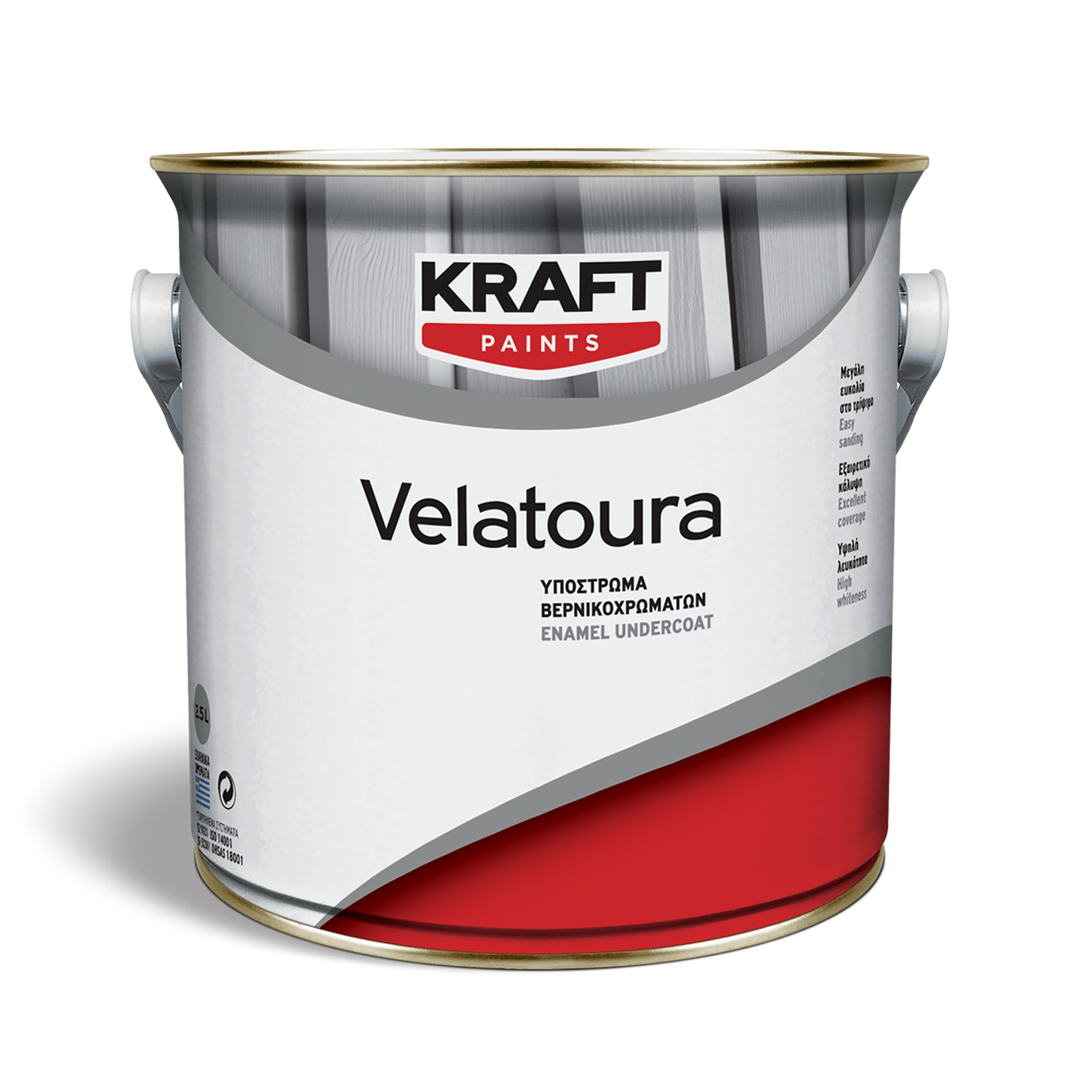 Η βελατούρα διαλύτου Kraft 0.75 λίτρου προσφέρει άριστη πρόσφυση σε ξύλινες και μεταλλικές επιφάνειες, δημιουργώντας σταθερή βάση για το τελικό χρώμα. Στεγνώνει γρήγορα και εξομαλύνει τις ατέλειες, προστατεύοντας από υγρασία και φθορά, ιδανική για πόρτες, κάγκελα και έπιπλα.
