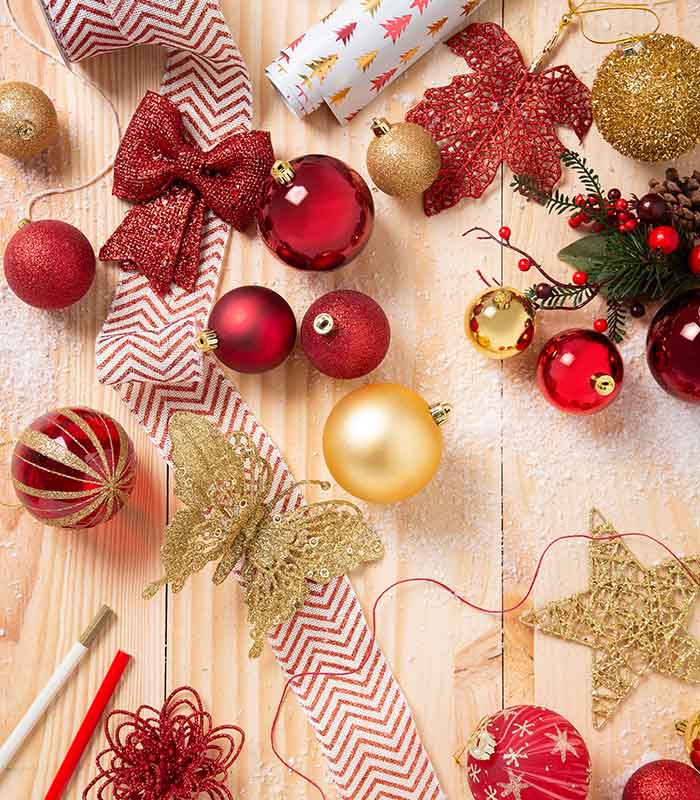 Must-haves: παραδοσιακές μπάλες σε κόκκινο, πράσινο και χρυσό, φιγούρες Άγιου Βασίλη, κλασικά στολίδια και κουκουνάρια.