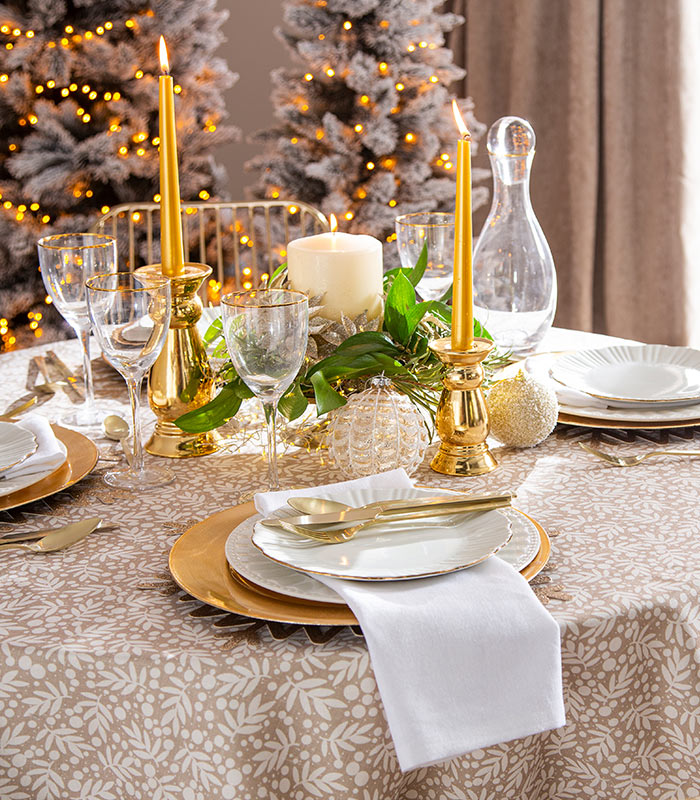 Ξεκίνα με ένα τραπεζομάντηλο σε απαλό μπεζ ή λευκό με διακριτικό σχέδιο, ώστε να δώσει υφή στο τραπέζι χωρίς να «φορτώσει» το αποτέλεσμα. Πρόσθεσε χρυσά chargers κάτω από τα λευκά πιάτα πορσελάνης και ολοκλήρωσε το στρώσιμο με λευκές πετσέτες που πέφτουν κομψά πάνω στο πιάτο.