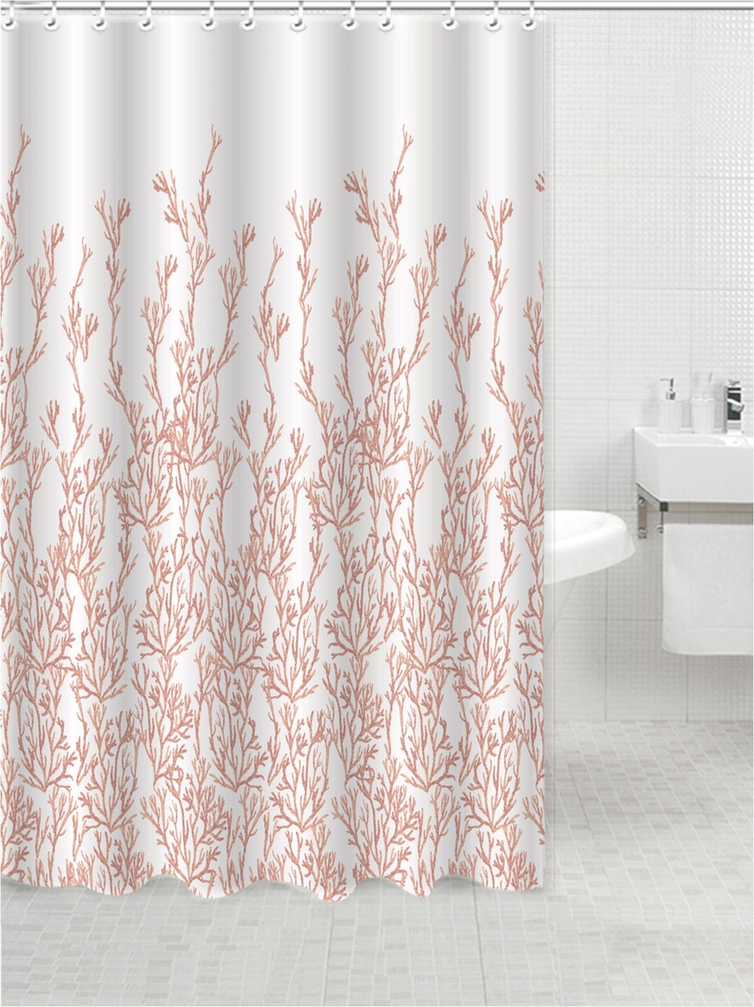 Κουρτίνα μπάνιου λευκή με μοτίβο σχέδια σε κοραλί απόχρωση από 100% πολυεστέρα. Διατίθεται σε διαστάσεις Π180xY200cm και είναι πολύ πρακτική και εύκολη στο καθάρισμα με ένα απλό πλύσιμο στο χέρι. Μια όμορφη και έξυπνη λύση για να διακοσμήσεις διαμορφώνοντας το στυλ του μπάνιου σου και παράλληλα να το προστατέψεις διατηρώντας το στεγνό από νερά.