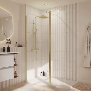 Κρυστάλλινος τοίχος ντους Remix, με προφίλ αλουμινίου και ράβδο σταθεροποίησης σε χρυσό φινίρισμα. Γυαλί ασφαλείας πάχους 8 mm με διάφανο φινίρισμα, ύψος 200 cm. Αναστρέψιμο περίβλημα για εγκατάσταση αριστερά ή δεξιά. Σχεδόν 30 πιθανές διαμορφώσεις χάρη στα προφίλ αλουμινίου σε χρώμιο, μαύρο ή brussed ορείχαλκο και στο διαφανές ή μεταξοτυπημένο γυαλί. Επεξεργασία κατά των αλάτων που εφαρμόζεται στο γυαλί για εύκολο καθάρισμα. Διατίθεται σε 6 μεγέθη, 5 προφίλ και φινιρίσματα γυαλιού. Με 10 χρόνια εγγύηση.
