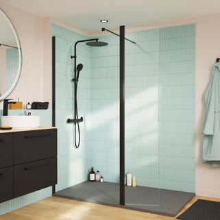 Κρυστάλλινος τοίχος ντους REMIX. Προφίλ αλουμινίου και ράβδος σταθεροποίησης σε μαύρο φινίρισμα. Διαφανές γυαλί ασφαλείας πάχους 8 mm, ύψους 200 cm. Αναστρέψιμο περίβλημα για εγκατάσταση αριστερά ή δεξιά. Σχεδόν 30 πιθανές διαμορφώσεις χάρη στα προφίλ αλουμινίου μας σε χρώμιο, μαύρο ή brussed ορείχαλκο και το διαφανές ή μεταξοτυπωμένο γυαλί μας. Επεξεργασία κατά των αλάτων που εφαρμόζεται στο γυαλί για εύκολο καθάρισμα. Διατίθεται σε 6 μεγέθη, 5 προφίλ και γυάλινα φινιρίσματα. Με 10 χρόνια εγγύηση.