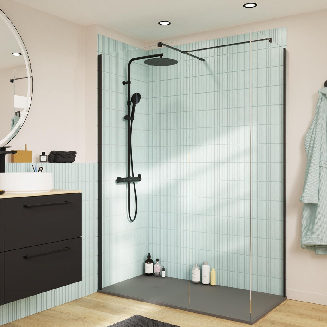 Κρυστάλλινος τοίχος ντους REMIX. Προφίλ αλουμινίου και ράβδος σταθεροποίησης σε μαύρο φινίρισμα. Διαφανές γυαλί ασφαλείας πάχους 8 mm, ύψους 200 cm. Αναστρέψιμο περίβλημα για εγκατάσταση αριστερά ή δεξιά. Σχεδόν 30 πιθανές διαμορφώσεις χάρη στα προφίλ αλουμινίου μας σε χρώμιο, μαύρο ή brussed ορείχαλκο και το διαφανές ή μεταξοτυπωμένο γυαλί μας. Επεξεργασία κατά των αλάτων που εφαρμόζεται στο γυαλί για εύκολο καθάρισμα. Διατίθεται σε 6 μεγέθη, 5 προφίλ και γυάλινα φινιρίσματα. Με 10 χρόνια εγγύηση.