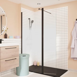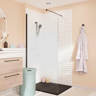 Κρυστάλλινος τοίχος ντους REMIX, με προφίλ αλουμινίου και ράβδο σταθεροποίησης σε μαύρο φινίρισμα. Γυαλί ασφαλείας πάχους 8 mm με φινίρισμα με μεταξοτυπία, ύψος 200 cm. Αναστρέψιμο περίβλημα για εγκατάσταση αριστερά ή δεξιά. Σχεδόν 30 πιθανές διαμορφώσεις χάρη στα προφίλ αλουμινίου σε χρώμιο, μαύρο ή brussed ορείχαλκο και στο διαφανές ή μεταξοτυπημένο γυαλί. Επεξεργασία κατά των αλάτων που εφαρμόζεται στο γυαλί για εύκολο καθάρισμα. Διατίθεται σε 6 μεγέθη, 5 προφίλ και φινιρίσματα γυαλιού. Με 10 χρόνια εγγύηση.