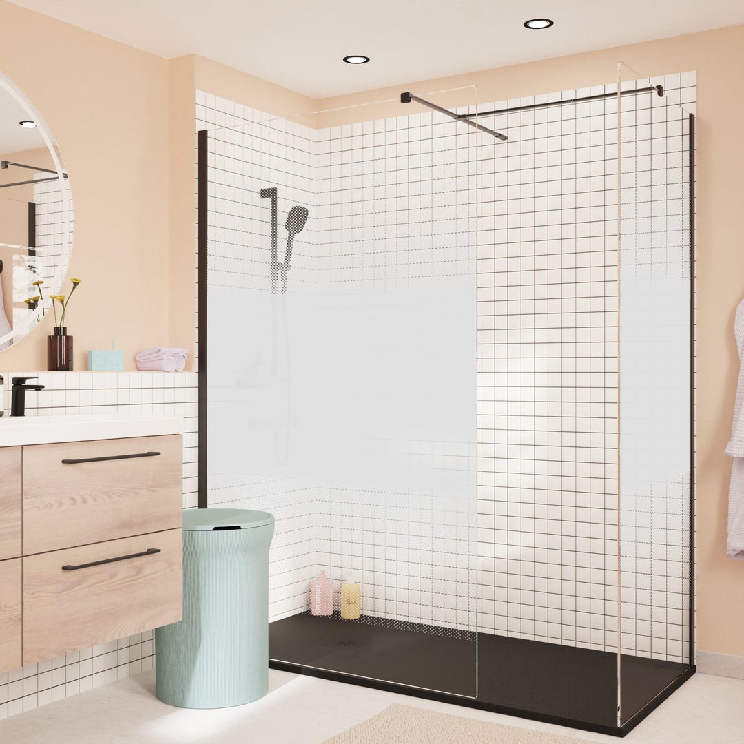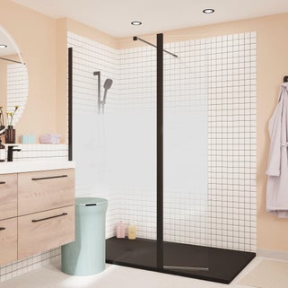 Κρυστάλλινος τοίχος ντους REMIX, με προφίλ αλουμινίου και ράβδο σταθεροποίησης σε μαύρο φινίρισμα. Γυαλί ασφαλείας πάχους 8 mm με φινίρισμα με μεταξοτυπία, ύψος 200 cm. Αναστρέψιμο περίβλημα για εγκατάσταση αριστερά ή δεξιά. Σχεδόν 30 πιθανές διαμορφώσεις χάρη στα προφίλ αλουμινίου σε χρώμιο, μαύρο ή brussed ορείχαλκο και στο διαφανές ή μεταξοτυπημένο γυαλί. Επεξεργασία κατά των αλάτων που εφαρμόζεται στο γυαλί για εύκολο καθάρισμα. Διατίθεται σε 6 μεγέθη, 5 προφίλ και φινιρίσματα γυαλιού. Με 10 χρόνια εγγύηση.