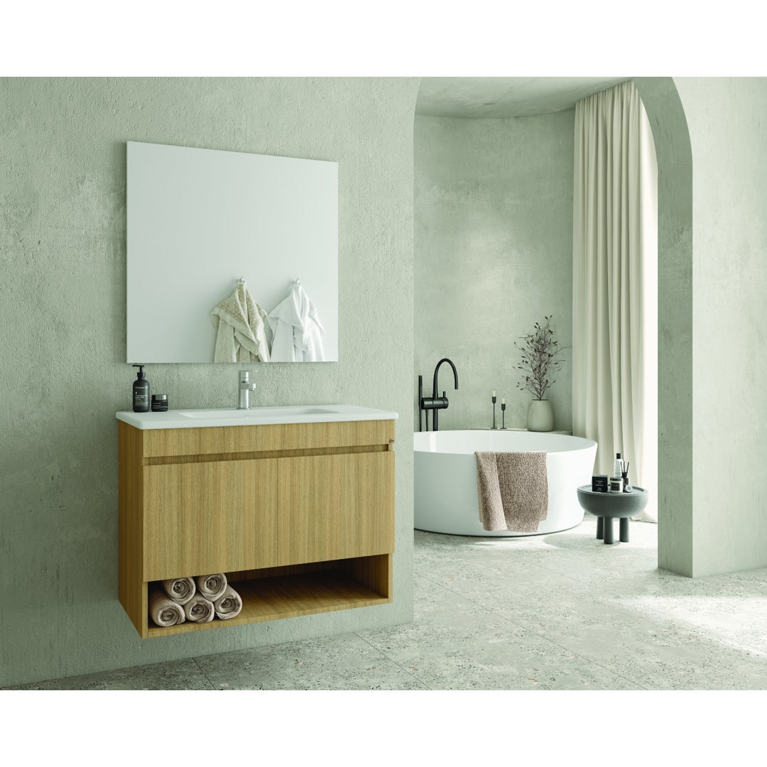 Έπιπλο μπάνιου Iris με 1 ντουλάπι και 1 ράφι από μοριοσανίδα επενδεδυμένη με μελαμίνη σε απόχρωση δρυός με ματ φινίρισμα. Το ντουλάπι διαθέτει 2 πόρτες ανοιγόμενες που προσφέρουν τον απαραίτητο αποθηκευτικό χώρο για να οργανώσεις όλα τα απαραίτητα αντικείμενά σου και κάτω από το ντουλάπι υπάρχει 1 ράφι για την τοποθέτηση αξεσουάρ μπάνιου όπως πετσέτες, ξυριστικά, οδοντόκρεμα, οδοντοβουρτσα, κρέμες περιποίησης προσώπου και οποιοδήποτε άλλο προϊόν σε εξυπηρετεί. Η σύνθεση του επίπλου περιλαμβάνει εναν κεραμικό ένθετο νιπτήρα μήκους 81cm σε λευκή απόχρωση και στο πάνω μέρος του επίπλου υπάρχει ένας καθρέπτης. Η Leroy Merlin σου δίνει τη δυνατότητα να συνδυάσεις την επιλογή σου με επιπλέον προιόντα όπως μπαταρία, ντουλάπι μπάνιου ή μια στήλη μπάνιου που θα ικανοποιήσει την ανάγκη σου για επιπλέον αποθήκευση και οργάνωση δίνοντας ένα ολοκληρωμένο αποτέλεσμα στο χώρο.