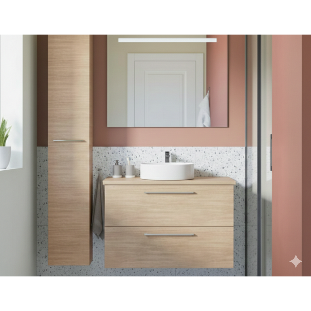 Έπιπλο μπάνιου Remix κρεμαστό σε απόχρωση δρυός. Διαθέτει 2 συρτάρια που προσφέρουν τον απαραίτητο αποθηκευτικό χώρο για να οργανώσεις όλα τα απαραίτητα αντικείμενά σου και ο μηχανισμός soft close τα βοηθά να κλείνουν αργά και αθόρυβα παρέχοντας επιπλέον ευκολία στην χρήση τους. Επιπλέον, διαθέτει εναν επικαθήμενο στρογγυλό κεραμικό νιπτήρα σε λευκή απόχρωση με διάμετρο 37cm και έναν πάγκο σε απόχρωση δρυός. Η συγκεκριμένη σύνθεση επίπλου περιλαμβάνει στην τιμή της την βάση επίπλου, τον νιπτήρα και τον πάγκο. Η Leroy Merlin σου δίνει τη δυνατότητα να συνδυάσεις την επιλογή σου με επιπλέον προϊόντα όπως καθρέπτη, μπαταρία ή μια στήλη μπάνιου που θα ικανοποιήσει την ανάγκη σου για επιπλέον αποθήκευση και οργάνωση δίνοντας ένα ολοκληρωμένο αποτέλεσμα στο χώρο. Το έπιπλο μπάνιου Remix προσαρμόζεται σε κάθε τύπο μπάνιου και ο εργονομικός του σχεδιασμός προσφέρει ευκολία και αντοχή στην καθημερινή χρήση.