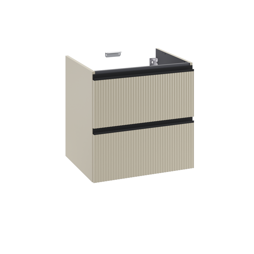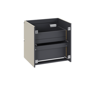 Βάση επίπλου μπάνιου Studio από μοριοσανίδα κρεμαστή με δυνατότητα για προσθήκη ποδιών. Έχει μαύρο χρώμα βάσης με προσόψεις σε απόχρωση μπεζ. Διαθέτει 2 συρτάρια με χειρολαβές εργονομικά σχεδιασμένες σε μαύρο ματ χρωματισμό που προσφέρουν τον απαραίτητο αποθηκευτικό χώρο για τα αντικείμενά σου. Είναι αρκετά ψηλά ώστε να αποθηκεύουν ακόμα και τα εμφιαλωμένα προϊόντα υγιεινής κάθετα και διαθέτουν πλήρες άνοιγμα που διευκολύνει την πρόσβαση σε ολόκληρο το συρτάρι, ακόμα και στα προϊόντα που είναι αποθηκευμένα στο πίσω μέρος. Επίσης, ο μηχανισμός soft close των συρταριών βοηθά να κλείνουν αργά και αθόρυβα παρέχοντας επιπλέον ευκολία στην χρήση τους. Στην ίδια σειρά Studio μπορείς να βρεις λεκάνη, μπαταρία, στήλη επίπλου, καθρέπτη και πάγκο για να ολοκληρώσεις να εναρμονίσετε το στυλ του μπάνιου σου και να του δώσεις μια βιομηχανική εμφάνιση δίνοντας ένα ολοκληρωμένο αποτέλεσμα στο χώρο.
